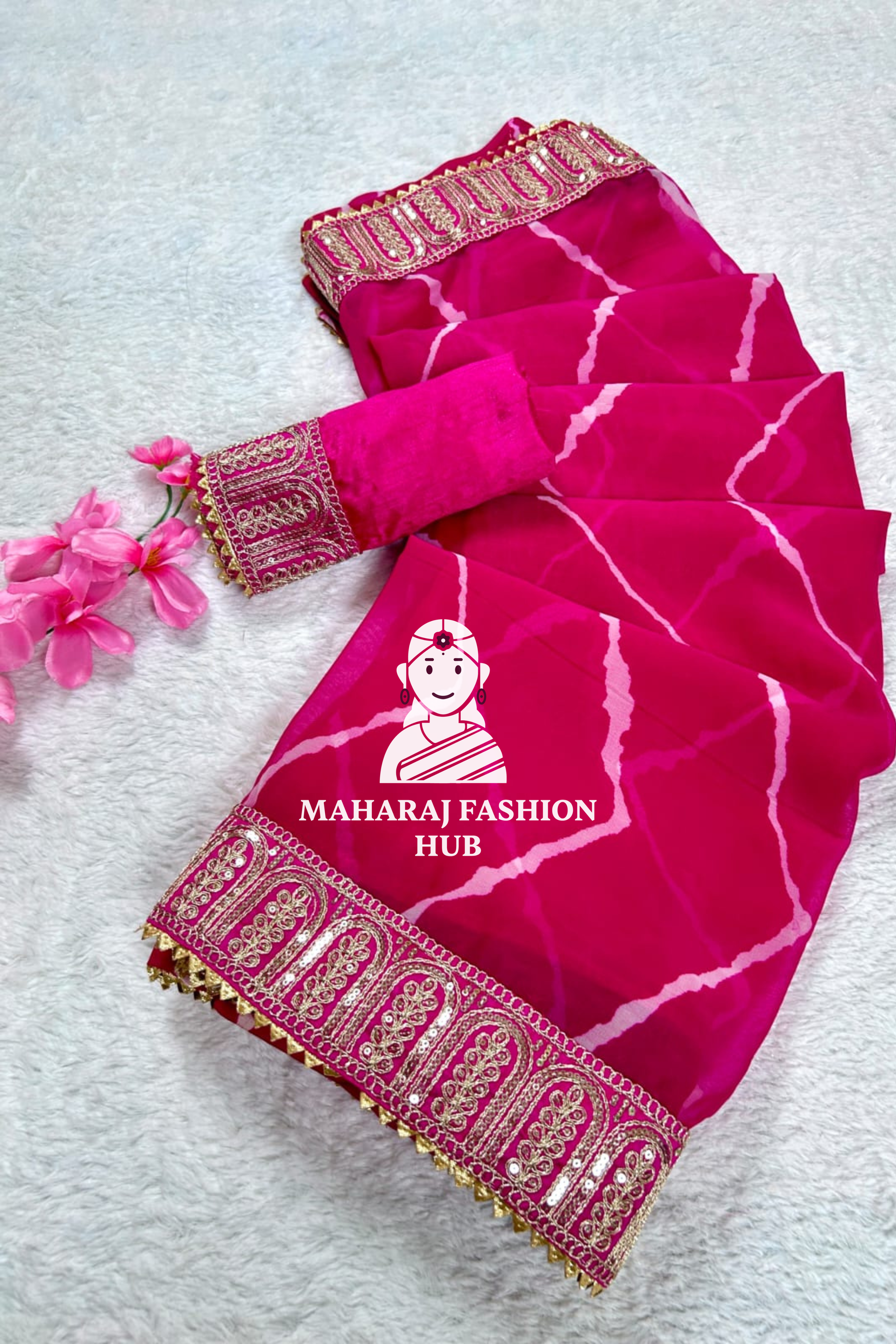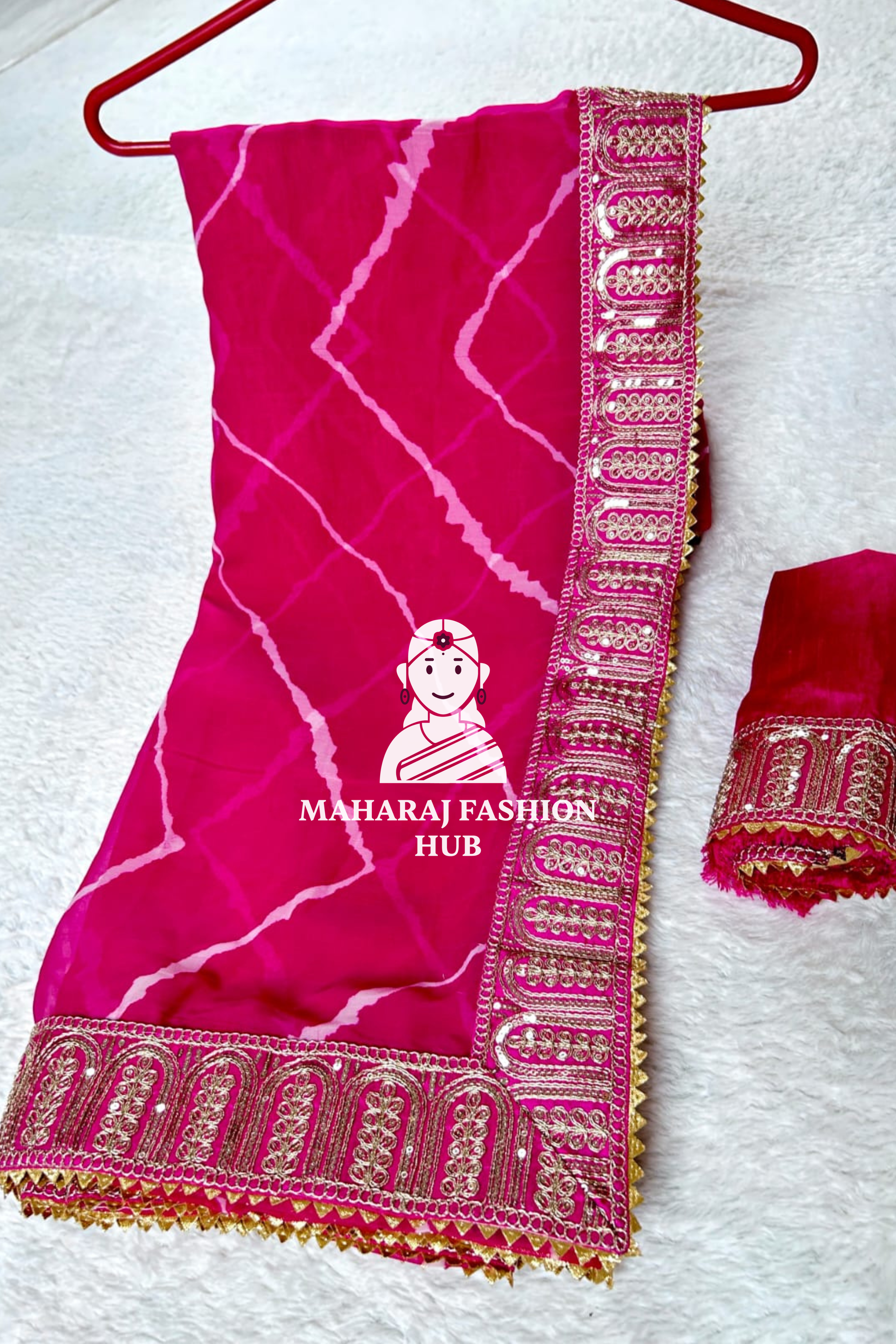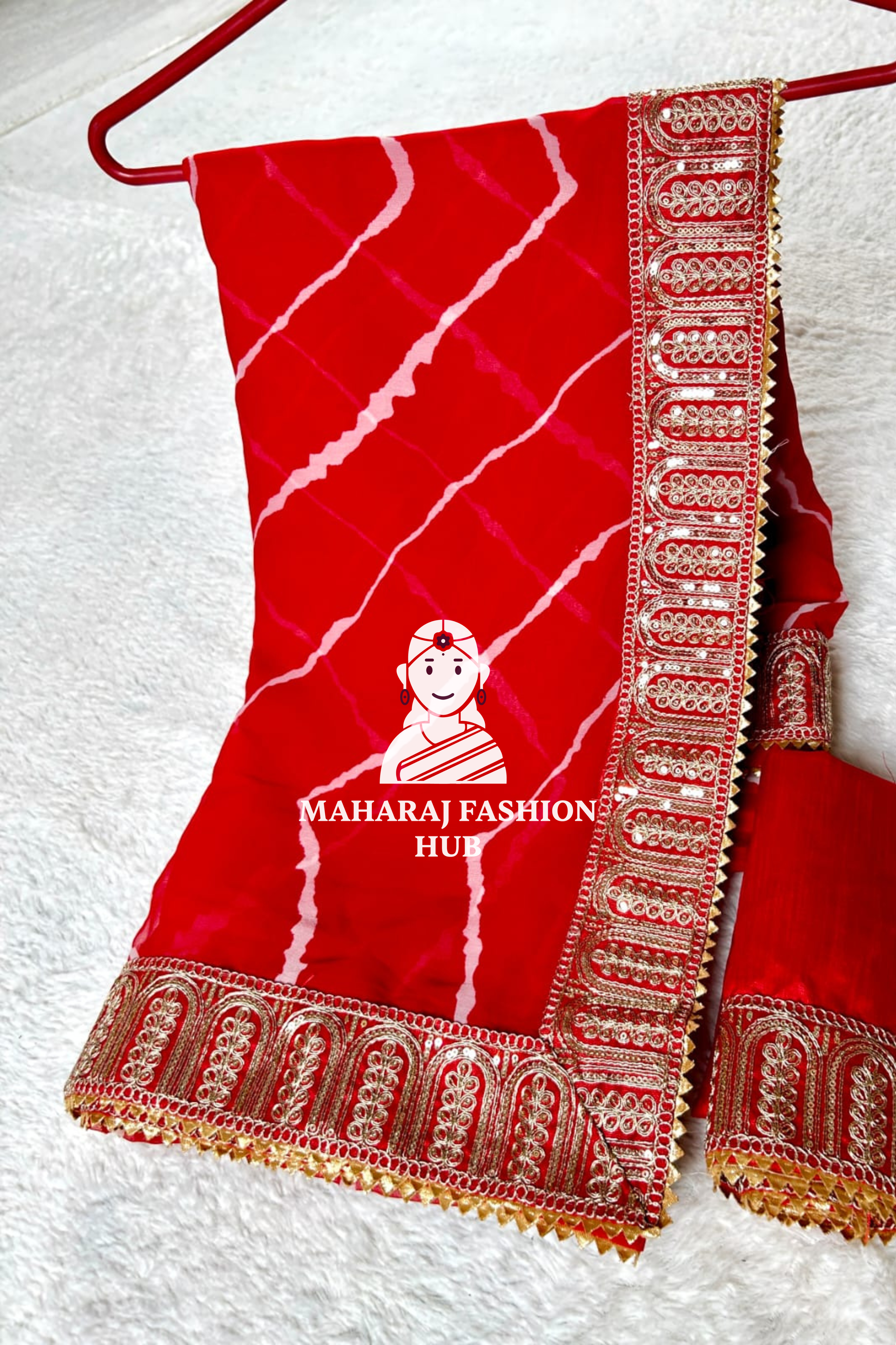The saree features a Leheriya pattern, a classic Rajasthani design with wave-like prints that add a vibrant touch.