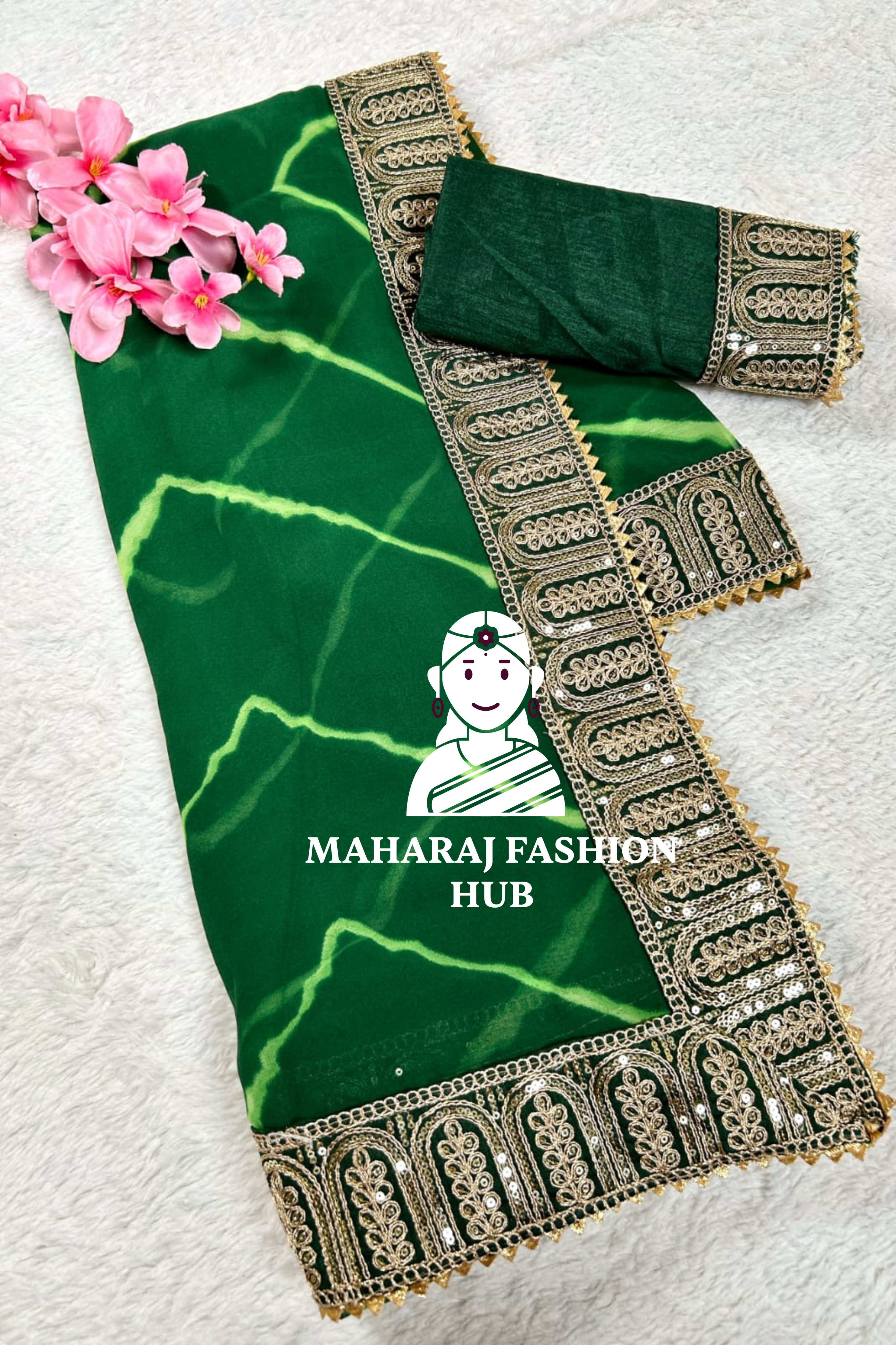 This saree comes with a matching blouse and showcases the beautiful Leheriya print on soft Georgette, making it a simple yet stylish choice.