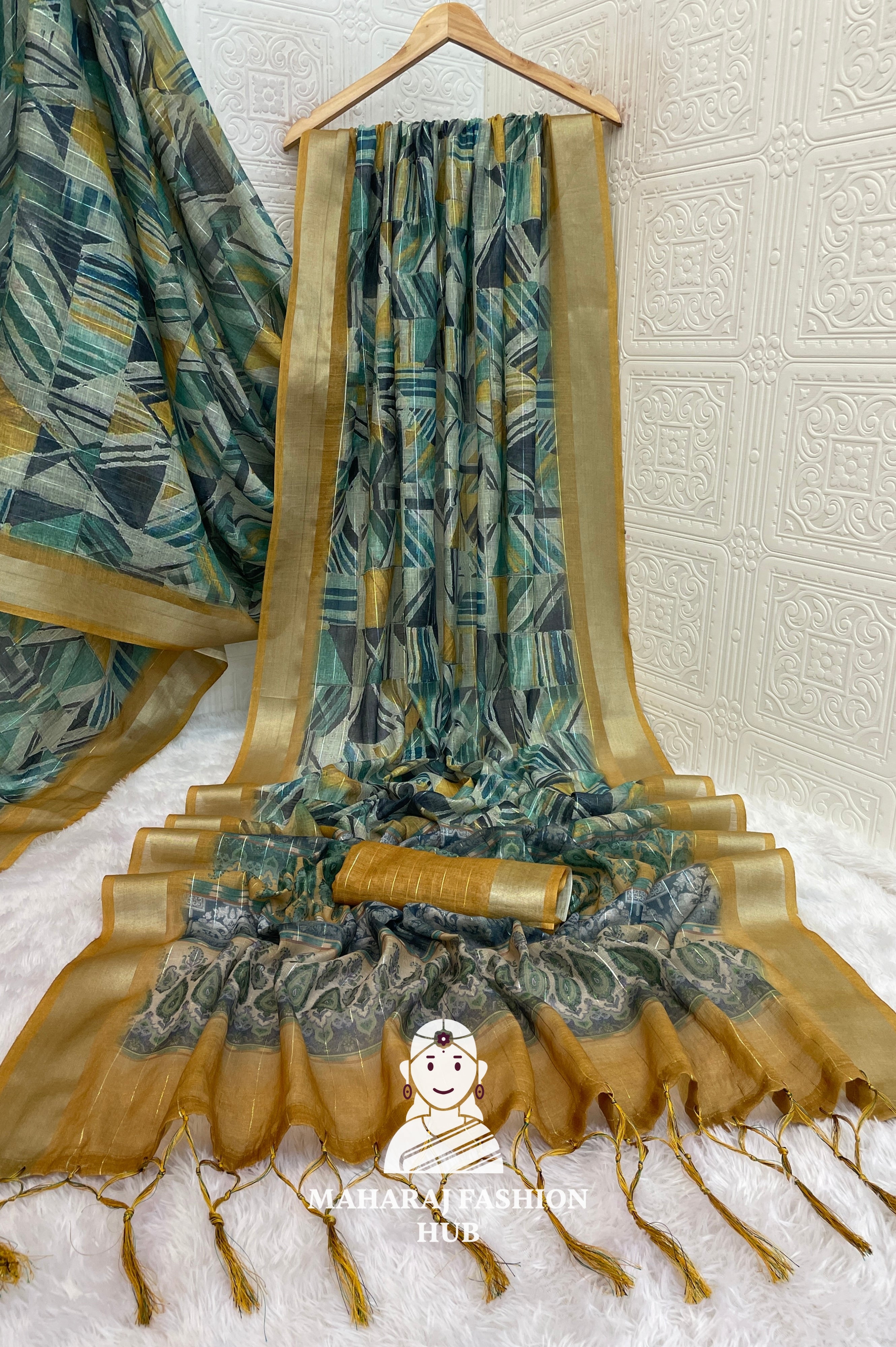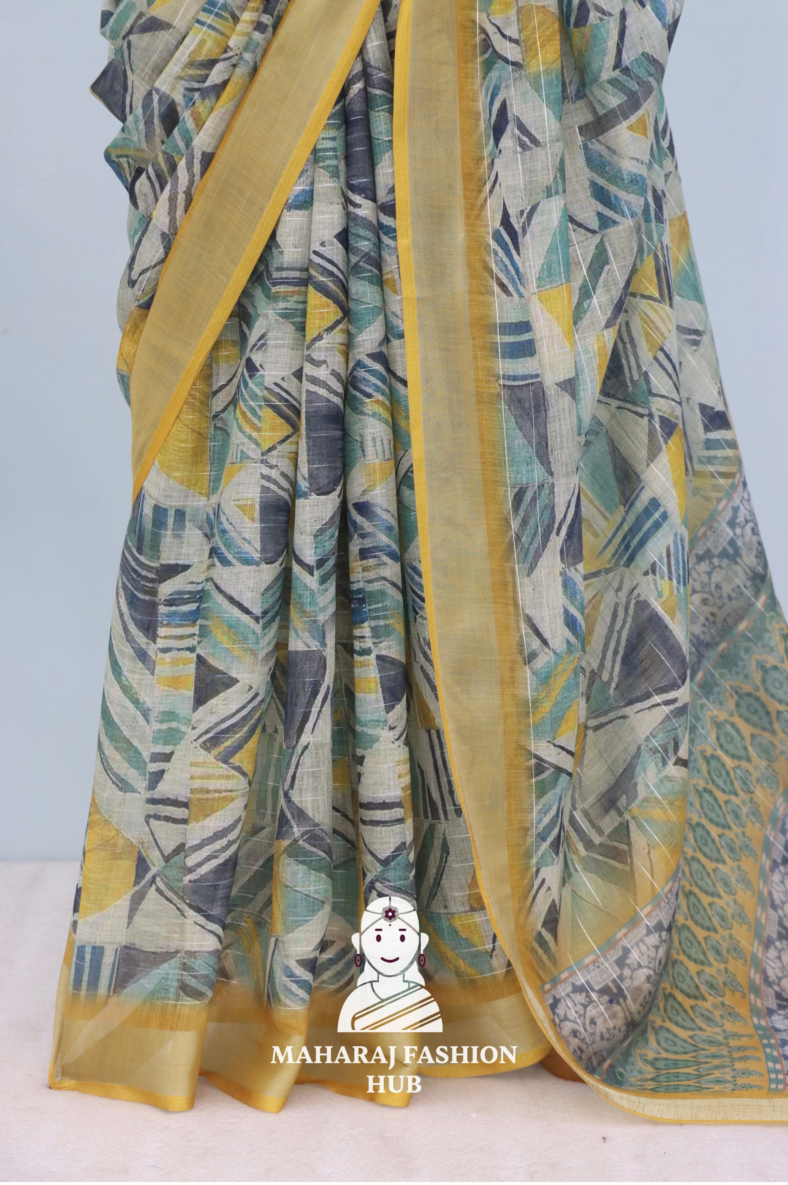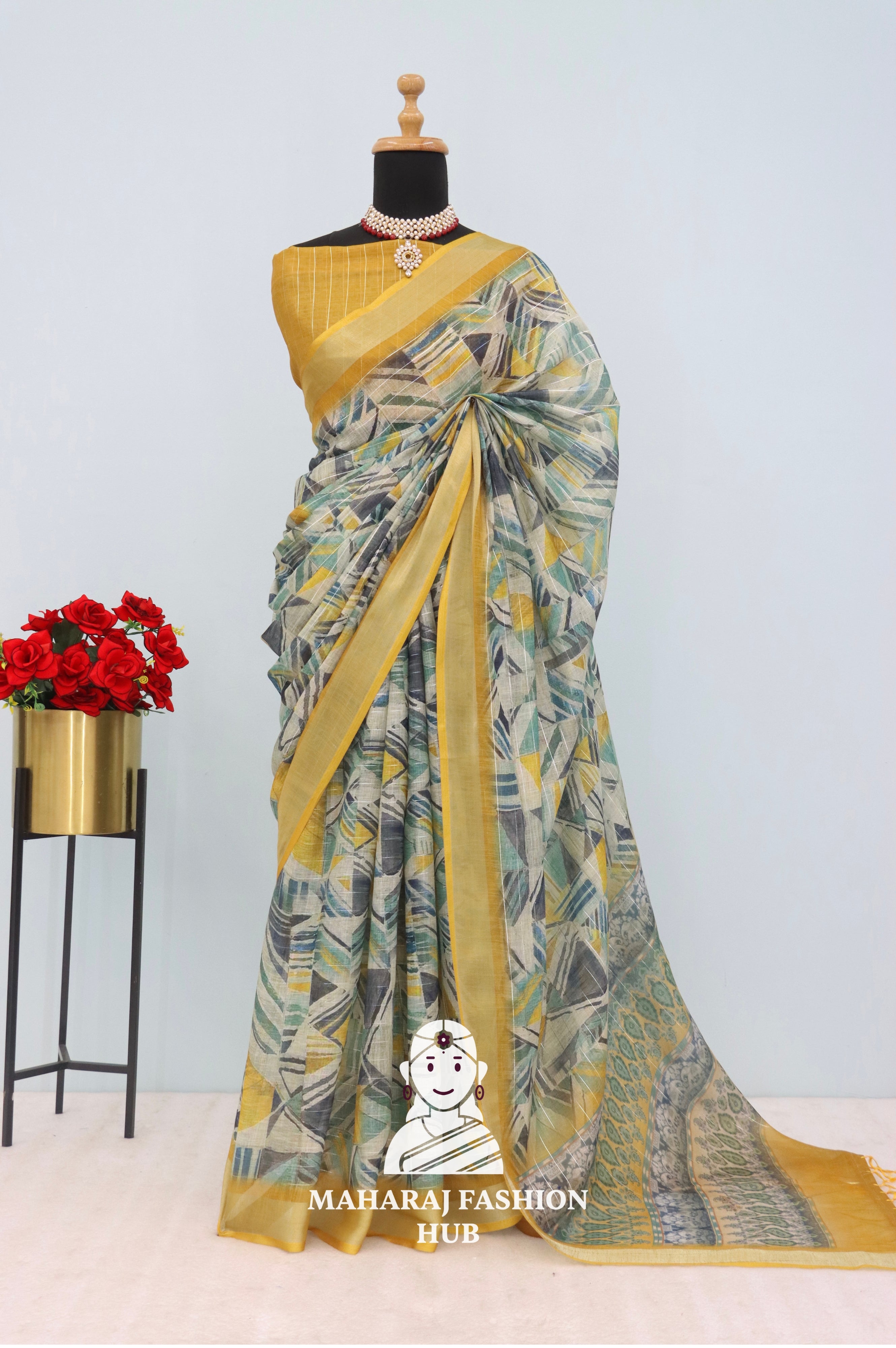 Crafted from premium Linen fabric featuring delicate Silver Jari Lines and a richly woven Border, this saree offers a lightweight, breathable drape that’s perfect for both comfort and class. The contemporary Digital Print adds a splash of modern artistry, creating a graceful contrast with its traditional detailing.