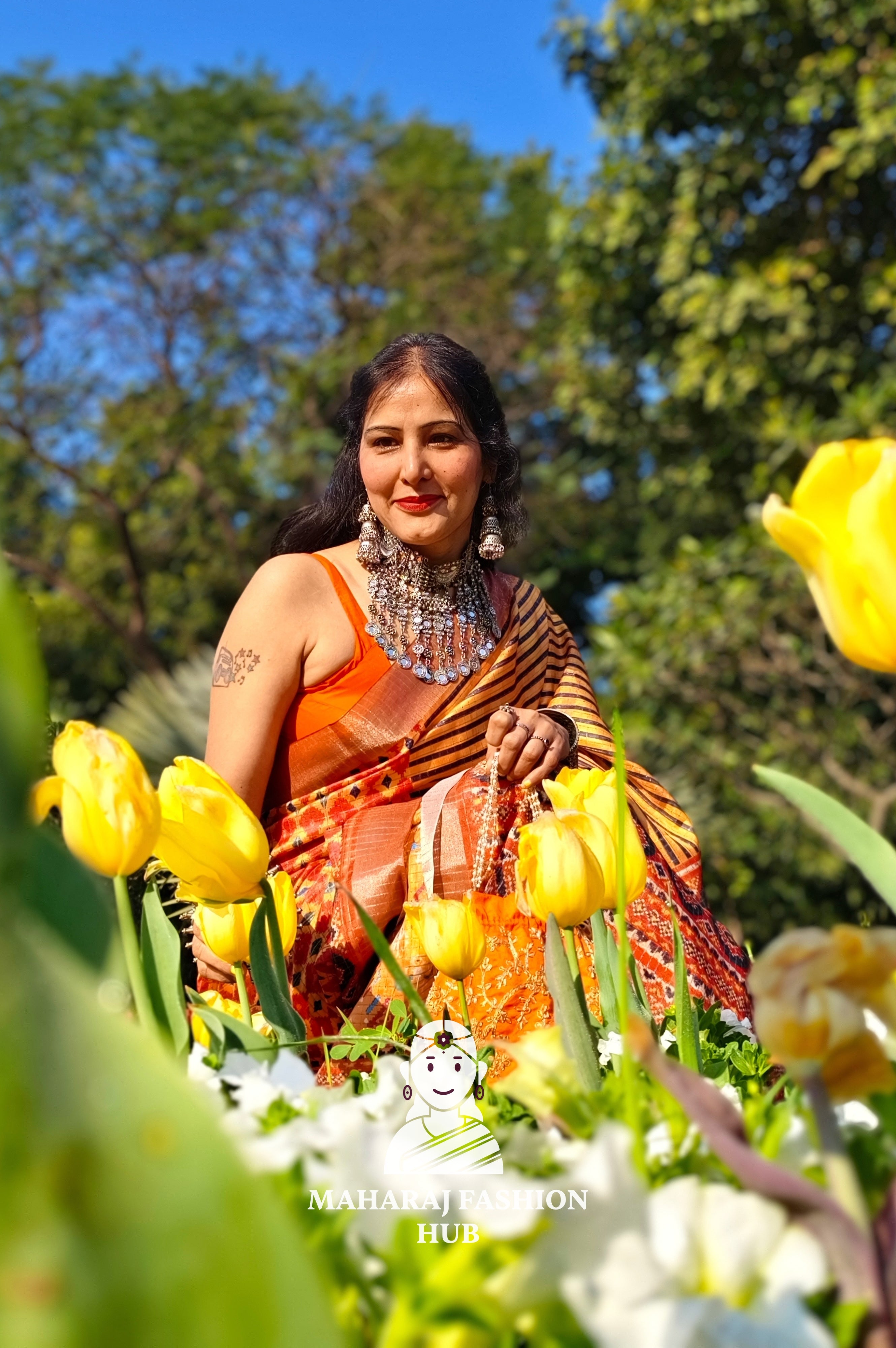 Indulge in the beauty of Mysore Silk, reimagined with elegant Digital Prints, classic Small Checks, and rich Pure Jari weaving. This saree is a perfect harmony of subtle texture and bold design—crafted for the woman who carries heritage with confidence.