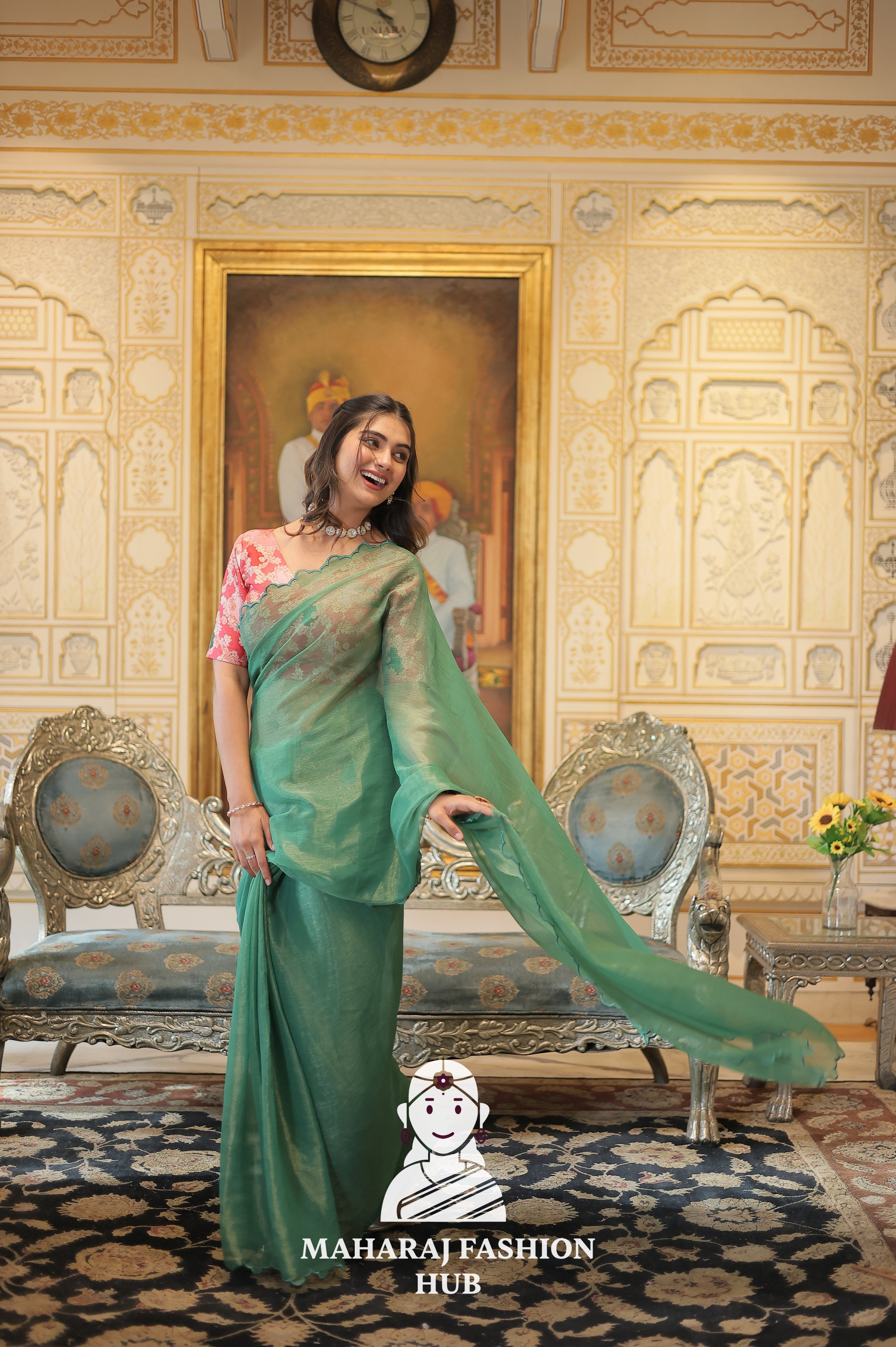 Crafted with the finest Gold Coin fabric, these sarees offer a lustrous drape and luxurious texture that gracefully flows with every movement. The intricate Arko Cut Work Border adds a regal touch, giving each saree a unique blend of subtle glamour and heritage charm.